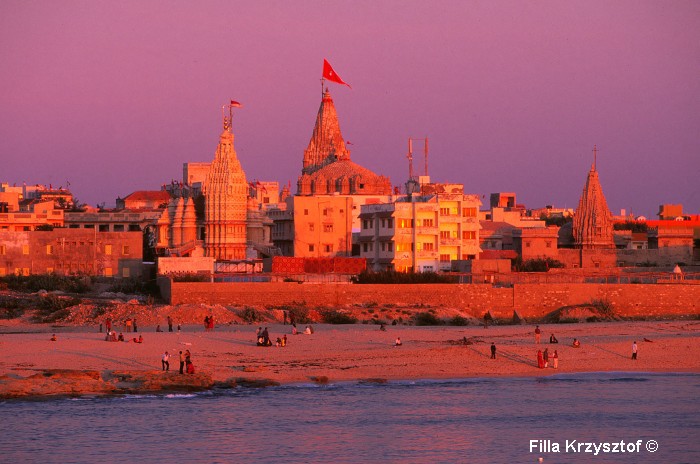 According to Mahabharata 5 thousands years ago Lord Krishna established in Dwarka the capital of his kingdom which was flooded by sea. The large waving flag on the top of the temple is changed 5 times a day in a ceremonial way.