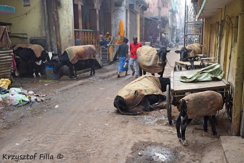 During winters and chilly nights in the north of India, cows are covered by some cloth.
