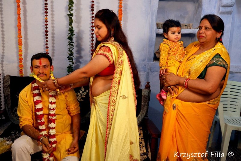 A day before the wedding, the groom makes a reception in his house (and the bride in her) to meet his family. Every participant is dressed in yellow, and everyone applies a yellow paste made of turmeric to the groom's face. The Haldi ceremony would be the equivalent of a stag or a hen party.