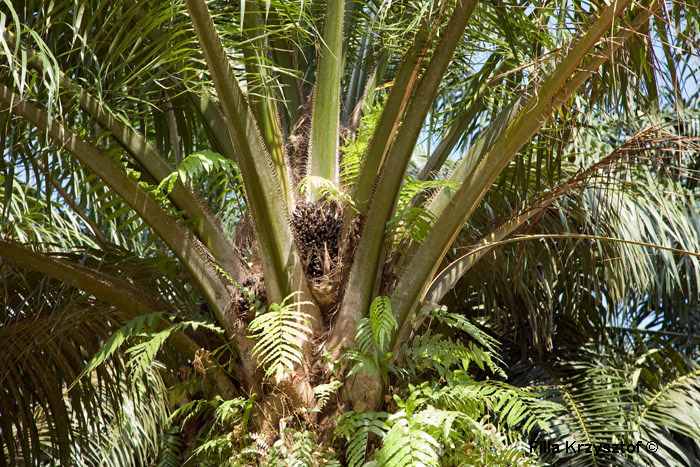 A bunch of fruits on an oil palm. The main product produced from these fruits is oil which is used for manufacturing margarine, soup, cosmetics, etc. But recently auto mobile industry wants to use it as fuel.